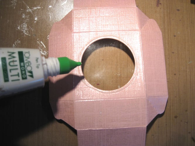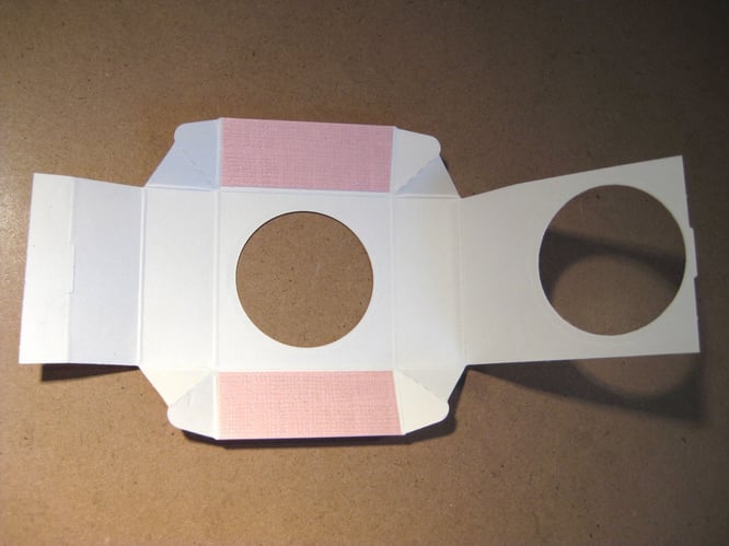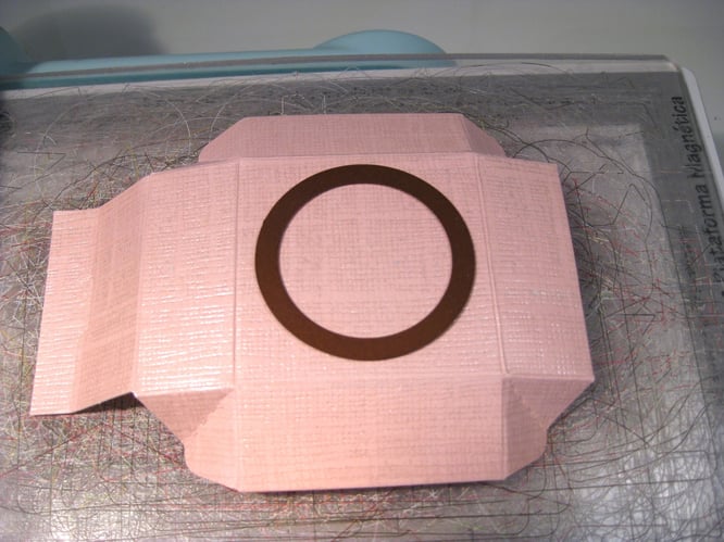 So sollte das Ganze dann aussehen. Eventuell muss man den inneren Kreis (hier rechts) noch etwas vergrößern, damit man ihn später von aussen nicht sieht. Jetzt habe ich eine Folie (von einer Stempelverpackung) auf die Größe des Deckels zurecht geschnitten und VOR! dem Zusammenbau des Deckels mit Kleber fixiert. Danach den Deckel der Schachtel zusammen setzten.
