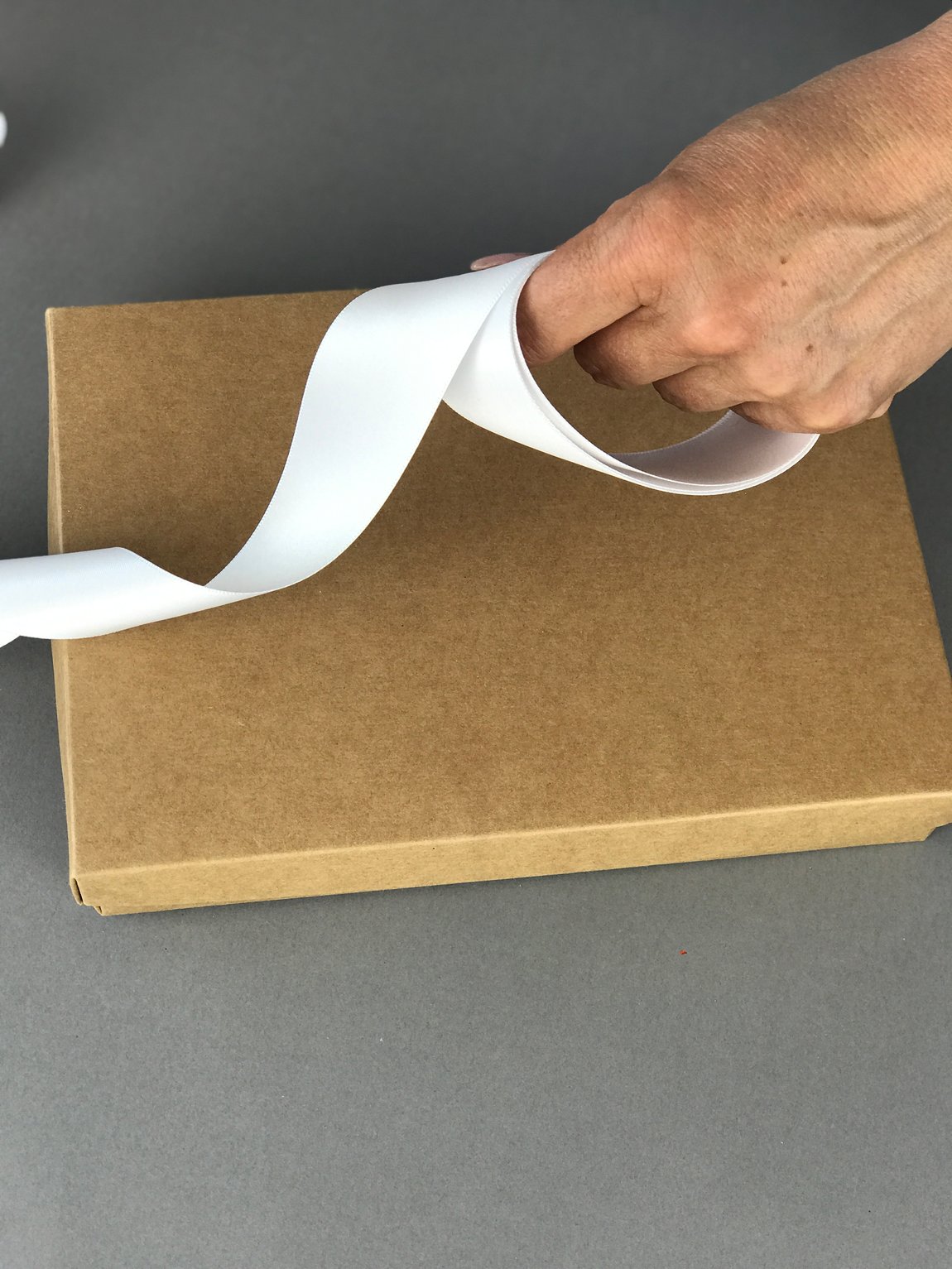 Nutze das Bindeband um die Schleife auf dem Geschenk fest zu binden.